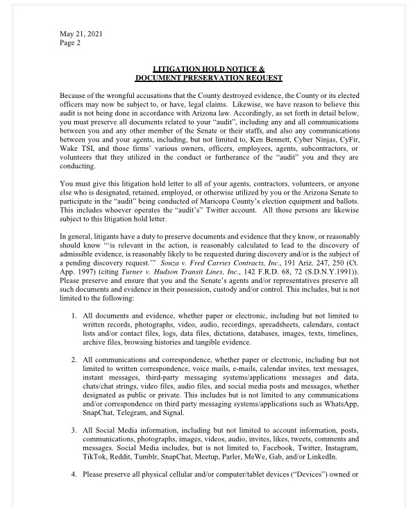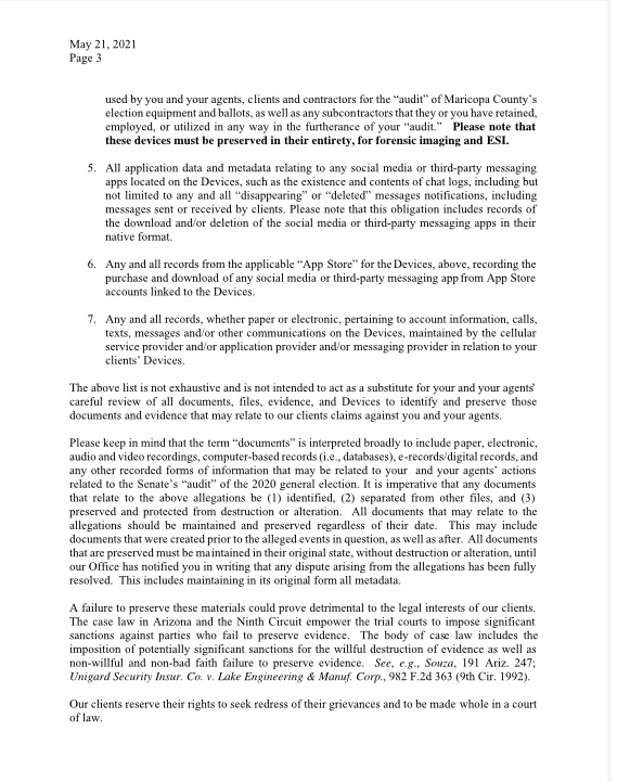 Parece que la Fiscal del Condado de Maricopa ha armado su oficina y la está utilizando para una posible investigación de los auditores. El Senado debe responder inmediatamente y pedir al abogado, al MCBOS y sus abogados, y a las corruptas «sin fines de lucro» demócratas que preserven los mismos artículos que se les pide que ahorren.