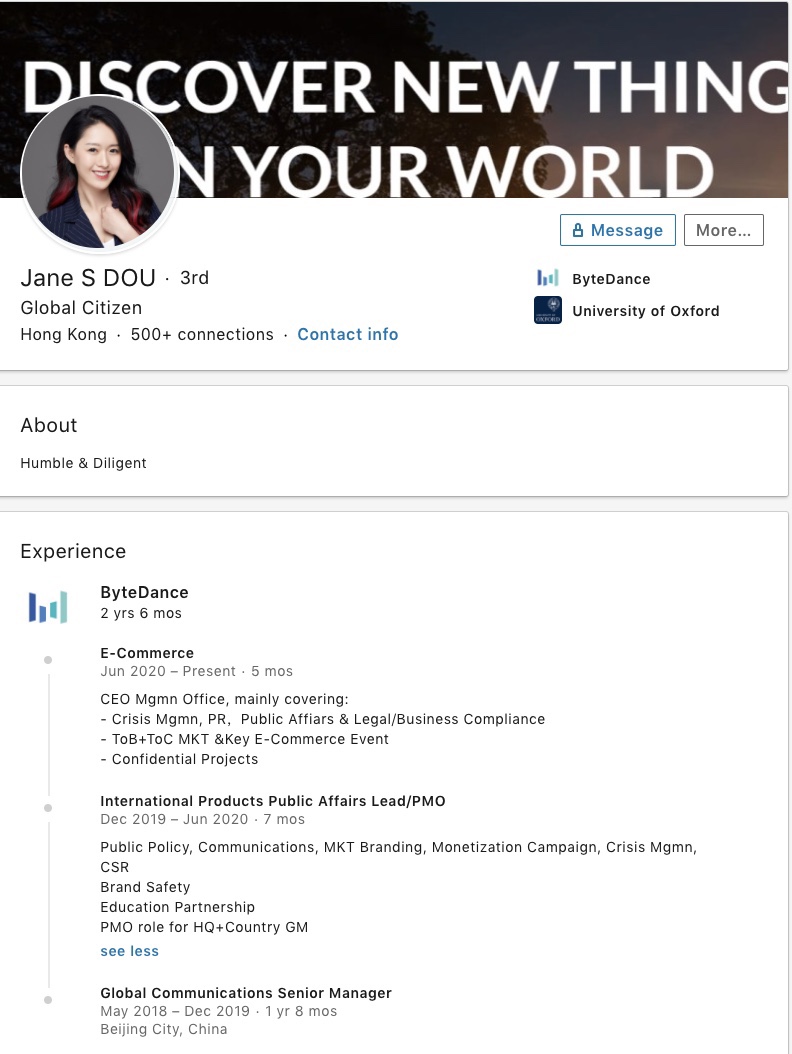 Jane Dou, que ha trabajado en Bytedance desde 2018, también sirvió en el Ministerio de Relaciones Exteriores de China. OnLinkedIn, se enumera a sí misma como trabajadora en la «Oficina del Presidente del Estado Xi Jinping» como intérprete de noticias en 2012.