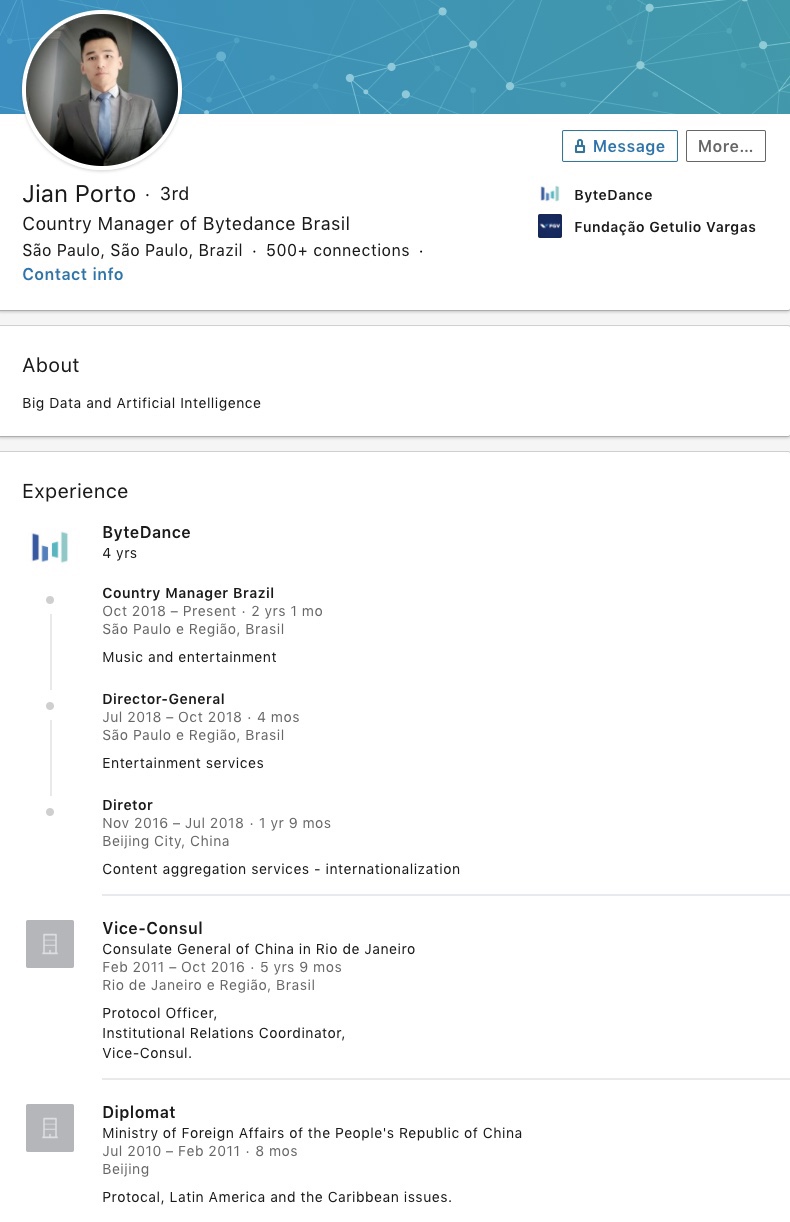 Jian Porto, que ha trabajado en Bytedance desde 2016, se desempeñó como funcionario del Partido Comunista Chino durante seis años antes de unirse a la compañía. Actualmente es gerente de país de ByteDance Brasil, Oporto se desempeñó como diplomático en el Ministerio de Relaciones Exteriores de China, centrándose en «cuestiones de América Latina y el Caribe» de 2010 a 2011.