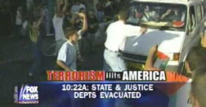 “El signo V de la victoria se muestra hoy en Jerusalén Oriental entre los jubilosos palestinos de que Estados Unidos haya sido objeto de este ataque”, dice el entonces reportero de Fox News, Brit Hume. “Vemos gente aplaudiendo, aplaudiendo, sonriendo, felices de saber que miles de estadounidenses han muerto en este ataque sorpresa”.
