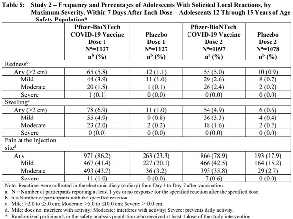 Esa hoja informativa contiene la siguiente tabla que detalla la alarmante tasa de efectos secundarios y daños experimentados por niños de 12 a 15 años (es decir, niños) que recibieron las inyecciones de ARNm: