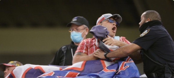 Un partidario del expresidente Donald Trump fue escoltado fuera del Estadio Yankee esposado después de colgar una gran pancarta pro-Trump de la segunda cubierta.