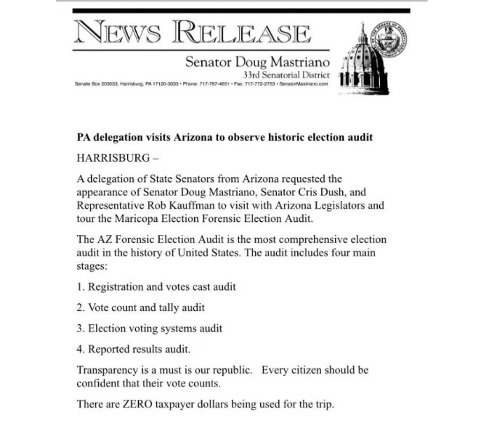 «Los miembros de la Delegación Legislativa de Pensilvania se están reuniendo con miembros de la Legislatura de Arizona para discutir la integridad electoral en los Estados Unidos en este momento».