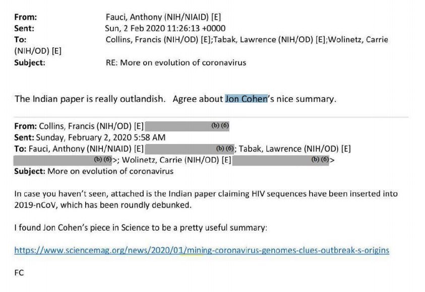 Ahora sabemos por la publicación de sus correos electrónicos que el artículo fue abordado por Fauci. También sabemos que el artículo fue retirado después de una campaña de la comunidad médica que sin duda incluyó al Dr. Fauci. En los correos electrónicos, el Dr. Fauci ignora el periódico indio de plano.