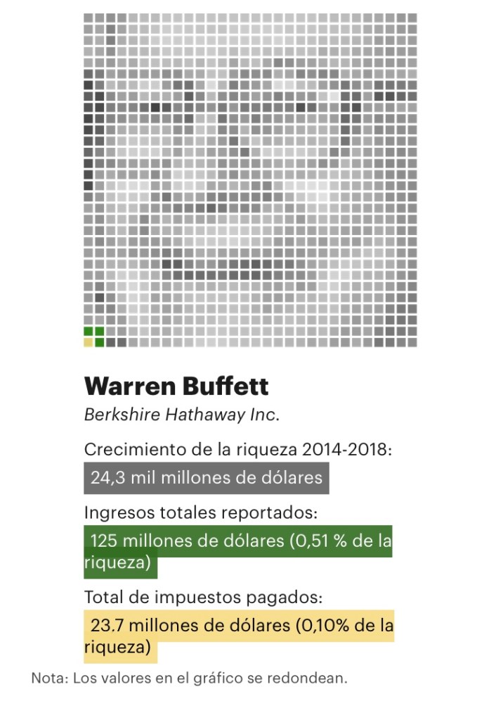 Buffett hizo algo en ese artículo que pocos estadounidenses hacen: reveló públicamente cuánto había pagado en impuestos federales personales el año anterior (6,9 millones de dólares). Por otra parte, Forbes estimó que su fortuna había aumentado 3 000 millones de dólares ese año. Utilizando esa información, un observador podría haber calculado su verdadera tasa impositiva; era del 0,2%. Pero entonces, como ahora, la discusión que siguió sobre los impuestos se centró en la tasa tradicional del impuesto sobre la renta.