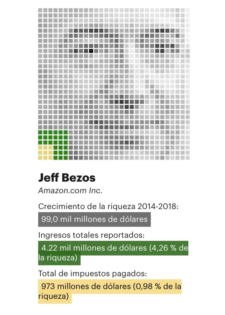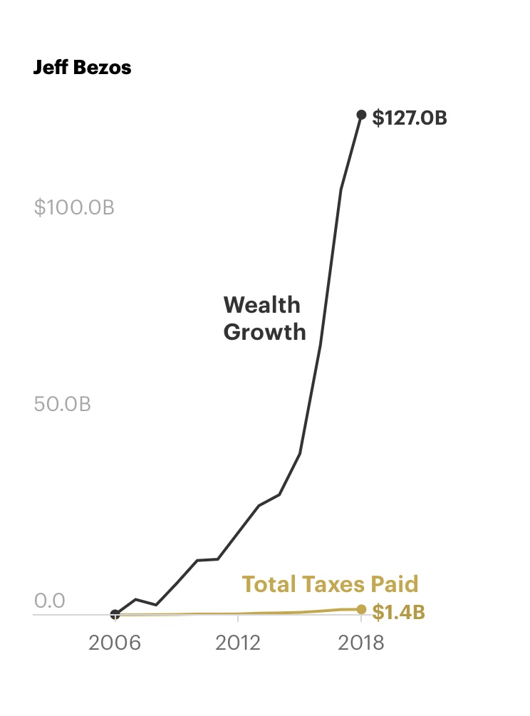 Su elusión fiscal es aún más llamativa si se examina de 2006 a 2018, un período para el que ProPublica tiene datos completos. La riqueza de Bezos aumentó en 127 000 millones de dólares, según Forbes, pero informó de un total de 6.500 millones de dólares en ingresos. Los 1.400 millones de dólares que pagó en impuestos federales personales son un número masivo, sin embargo, equivalen a una verdadera tasa impositiva del 1,1% en el aumento de su fortuna.