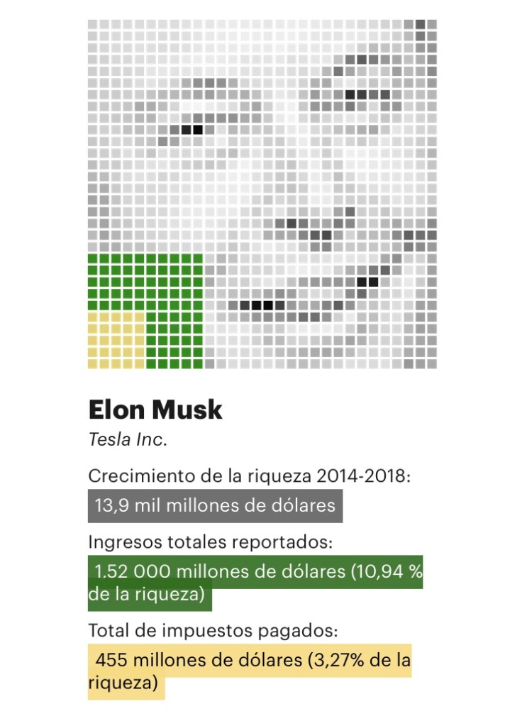 Con la excepción de un año en el que ejerció más de mil millones de dólares en opciones de acciones, las facturas de impuestos de Musk de ninguna manera reflejan la fortuna que tiene a su disposición. En 2015, pagó $68,000 en impuestos federales sobre la renta. En 2017, fue de 65.000 dólares, y en 2018 no pagó ningún impuesto federal sobre la renta. Entre 2014 y 2018, tuvo una verdadera tasa impositiva del 3,27%.