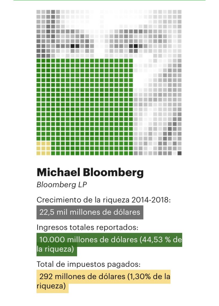 En 2018, reportó ingresos de $1,9 mil millones. Cuando se trató de sus impuestos, Bloomberg logró recortar su proyecto de ley utilizando deducciones hechas posibles por los recortes de impuestos aprobados durante la administración Trump, donaciones caritativas de 968,3 millones de dólares y créditos por haber pagado impuestos extranjeros. El resultado final fue que pagó 70,7 millones de dólares en impuestos sobre la renta por esos casi 2.000 millones de dólares en ingresos. Eso equivale a solo una tasa convencional del impuesto sobre la renta del 3,7%. Entre 2014 y 2018, Bloomberg tuvo una verdadera tasa impositiva del 1,30%.