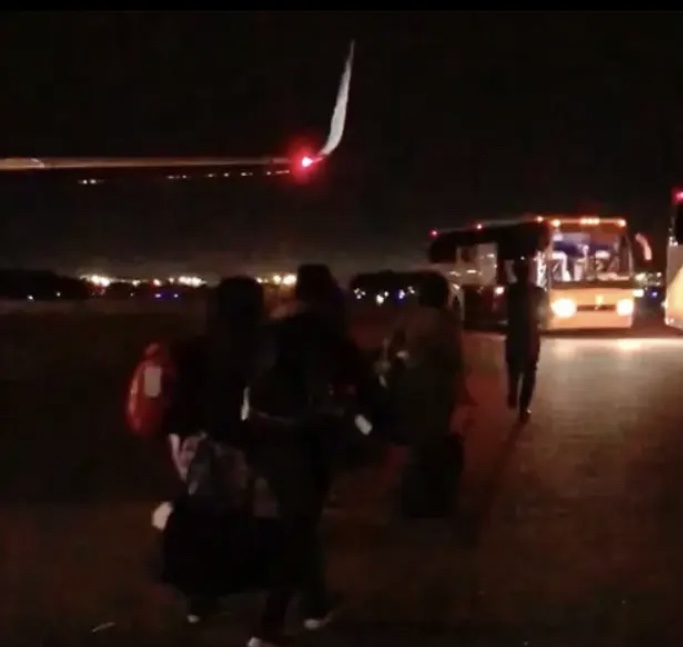 Los niños son dirigidos a autobuses que los estaban esperando en la pista.