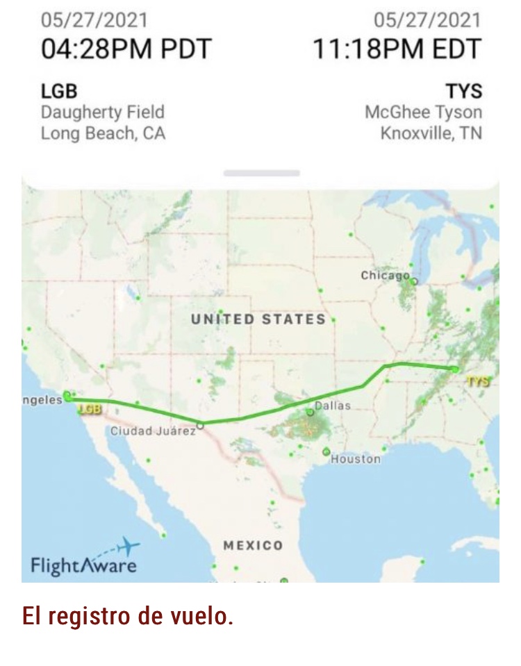 Los registros de vuelo muestran que el avión se originó en Long Beach, California, y aterrizó en el aeropuerto McGhee Tyson en la terminal TacAir justo después de las 11:15 p.m. Según informes de KCAL, afiliada a CBS, cientos de niños encontrados en la frontera estaban detenidos en un centro de convenciones en Long Beach, California.