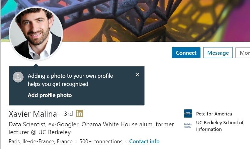 Anteriormente, el perfil de LinkedIn de Xavier Malina lo incluía como un «alumno de Obama en la Casa Blanca». Malina realizó un proyecto sobre la operación de voluntariado de la campaña de Obama en 2008 en UC Berkeley, donde era estudiante de posgrado. La biografía de Malina en Twitter anteriormente lo etiquetaba como «Alumno de la Casa Blanca de Obama», pero posteriormente eliminó ese crédito.