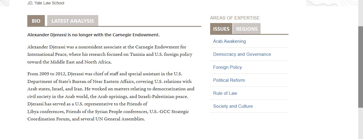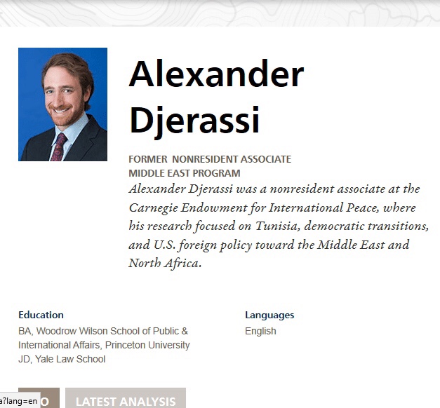 “Alexander Djerassi fue un asociado no residente en Carnegie Endowment for International Peace, donde su investigación se centró en Túnez y la política exterior de Estados Unidos hacia el Medio Oriente y África del Norte. De 2009 a 2012, Djerassi fue jefe de gabinete y asistente especial en la Oficina de Asuntos del Cercano Oriente del Departamento de Estado de Estados Unidos, cubriendo las relaciones de Estados Unidos con los estados árabes, Israel e Irán.