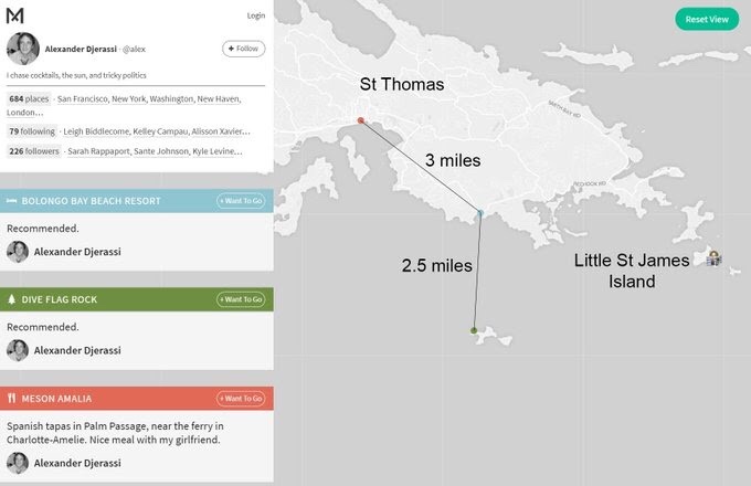 Alexander Djerassi, sobrino de Ghislaine Maxwell, visitó las Islas Vírgenes de EE. UU. La presencia de Djerassi está registrada en el sitio de medios sociales de viajes Marker, my.place.es/alex , a pocos kilómetros del escondite criminal de Jeffrey Epstein, Little Saint James Island. Este descubrimiento inesperado fue realizado por el investigador ciudadano @ Eye5W1de0pen (que también incluyó el gráfico de Little St James Island):
