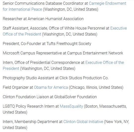 La página de contratación de señales de Xavier Maxwell incluye créditos como «Asistente de personal, Asociado, Oficina del personal de la Casa Blanca en la Oficina Ejecutiva del Presidente» y una pasantía en la Oficina Ejecutiva del Presidente. También enumera trabajos con Google, el Carnegie Endowment for International Peace, y como organizador de campo de Obama for America y una pasantía en la Iniciativa Global Clinton, y un rol de Enlace de la Fundación Clinton en la Fundación GlobalSolver.