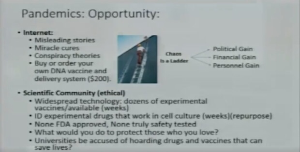 Mientras habla sobre la siguiente diapositiva – «Pandemias: Oportunidad» – Baric postula que «las pandemias realmente son tiempos de oportunidades».