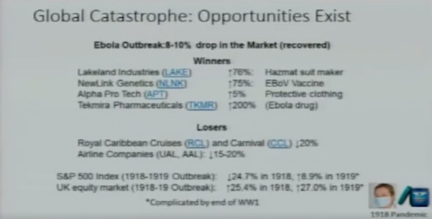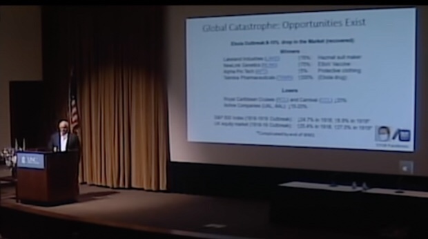Durante su discurso de 2018 «Imaginando la próxima pandemia de gripe – ¡y previniéndola!» presenta una diapositiva titulada «Catástrofe global: existen oportunidades». La diapositiva describe qué tipo de acciones e industrias aumentaron durante el brote de ébola, que utiliza para extrapolar el asesoramiento financiero sobre cómo «ganar dinero en la próxima pandemia».
