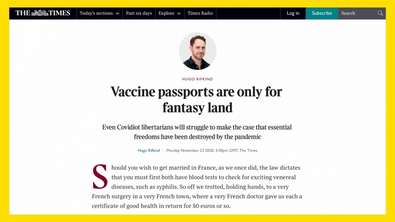 Hugo Rifkind del Times of London criticó a los ciudadanos con mentalidad de libertad utilizando el estremecedor portmanteau «Covidiot».