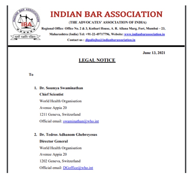 El Colegio de Abogados de la India ha notificado un aviso legal por desacato a los tribunales y crímenes contra la humanidad al director general de la Organización Mundial de la Salud, el Dr. Tedros Adhanom Gebreyesus, y al científico jefe de la OMS, el Dr. Soumya Swaminathan.