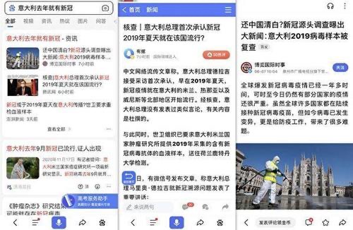 Capturas de pantalla de informes de medios chinos que afirman que COVID-19 se originó en Italia. (Capturas de pantalla/The Epoch Times)