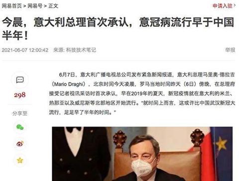 Una noticia de última hora apareció en varios sitios web populares en chino el 7 de junio afirmando que el Primer Ministro italiano Mario Draghi había admitido que la pandemia COVID-19 se había originado en Italia en una entrevista virtual de Radiotelevi-sione Italiana (RAI). Los informes chinos afirmaban que Italia había confundido los brotes de COVID en Milán, Génova y Venecia en el verano de 2019 con gripe.