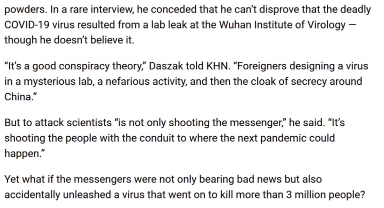 «Incluso Daszak ahora admite que no puede refutar la hipótesis de fuga de laboratorio. Esto puede sonar obvio o mundano, pero la carta cantó una melodía diferente», añade Marinos. Sin embargo, Daszak no dejará de llamarlo una «teoría de la conspiración», como ilustra el siguiente pasaje: