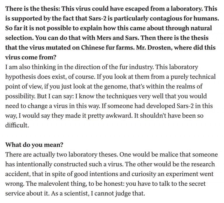 Drosten afirma con razón en el párrafo citado anteriormente que no se pueden determinar las intenciones simplemente mirando al virus, si resulta que el SARS-CoV-2 se construyó en un laboratorio.