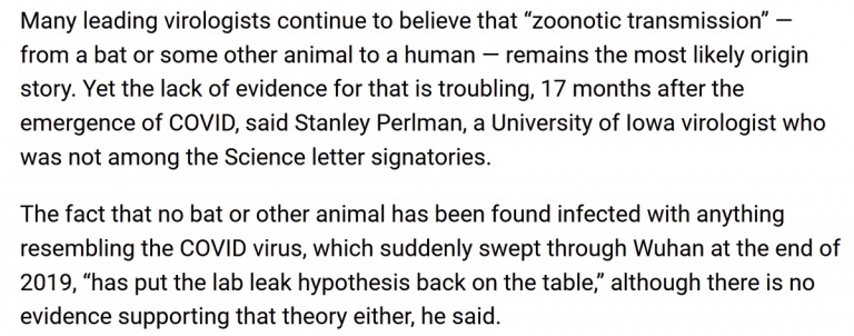 «Stanley Perlman, microbiólogo y profesor de la Universidad de Iowa, en Iowa City, aparece como coautor de la declaración», subraya el artículo. «En un correo electrónico a Undark, escribió que la idea de fuga de laboratorio ‘tiene varios aspectos, que van desde la declaración de que el virus fue diseñado en un laboratorio hasta aquellos que afirman que el virus se filtró de un laboratorio pero no fue diseñado'».