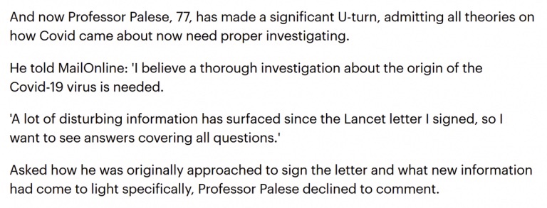 «El Dr. Peter Palese, un microbiólogo de la Escuela de Medicina de Icahn en Mount Sinai en Nueva York, firmó la carta en The Lancet en febrero del año pasado afirmando que el virus solo podría haber sido de origen natural y sugerir lo contrario crearía ‘miedo, rumores y prejuicios'», informó el Daily Mail.