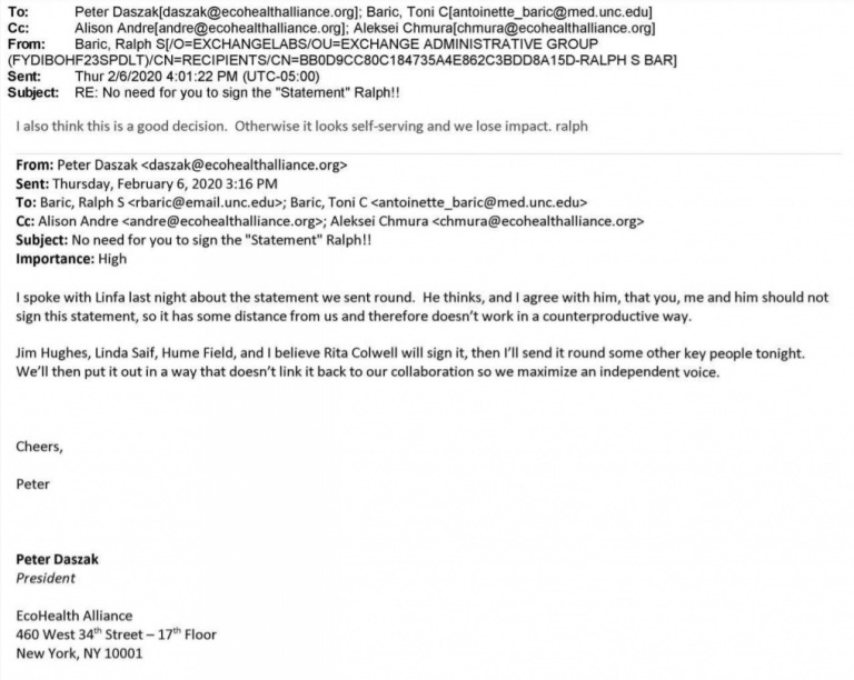 Marinos luego produce un correo electrónico bastante impresionante que establece la conexión entre EcoHealth Alliance y los signatarios de la carta.