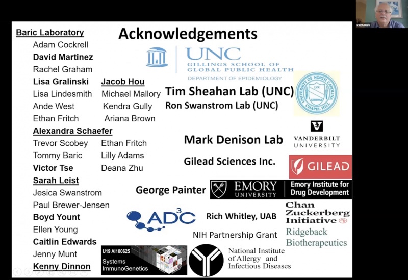 Una diapositiva de una presentación de Baric sobre el asunto también enumeró el apoyo de Gilead Sciences, los Institutos Nacionales de Salud y el Dr. Instituto Nacional de Alergias y Enfermedades Infecciosas de Fauci.