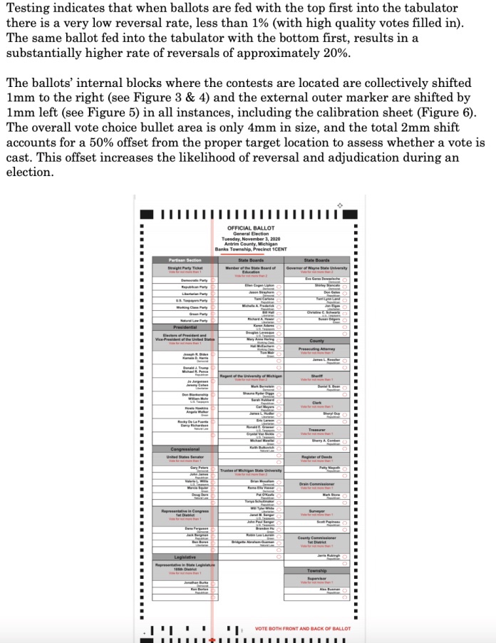 El Anexo 8 muestra evidencia de anomalías en la boleta y errores de calibración de la boleta. Un desplazamiento de una imagen en la dirección incorrecta de una forma u otra tiene el potencial de afectar la forma en que se registra un voto. También comentó sobre la introducción de papeletas en el tabulador: