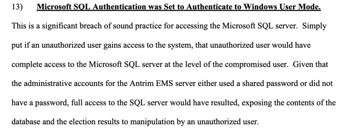 “ También valida que el sistema se encuentra en un estado tal que un usuario no autorizado puede omitir fácilmente las contraseñas del sistema y la base de datos para lograr un acceso sin restricciones al sistema de votación en cuestión de minutos. Estas manipulaciones y metodologías de omisión de contraseñas se pueden realizar de forma remota si el usuario no autorizado obtiene acceso al sistema a través de la red privada o la Internet pública. «