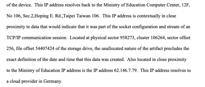 También habló sobre los artefactos y configuraciones de direcciones IP que “identifican definitivamente dos cosas, 1) el dispositivo se ha utilizado activamente para comunicaciones de red y 2) que este dispositivo se ha comunicado con direcciones IP públicas que no se encuentran en los Estados Unidos. Se necesitarían más análisis y dispositivos adicionales para determinar el período de tiempo de estas comunicaciones IP públicas «.