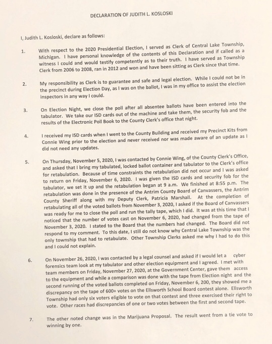 DePerno presentó varios documentos nuevos la segunda semana de junio. Una de esas declaraciones juradas, en su moción de reconsideración recién presentada , se captura en el Anexo 6 a continuación. Muestra una declaración jurada de la secretaria del condado de Central Lake Township, Judith Kosloski.