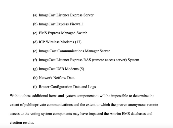 Cotton concluyó con la incapacidad del condado de Antrim de “ producir todo el equipo de votación para la preservación y el análisis digital. ”Según la declaración jurada,“ el condado de Antrim no produjo los siguientes componentes del sistema enumerados en los documentos de compra. Es muy difícil determinar el impacto en las elecciones del condado de Antrim de las irregularidades encontradas sin los componentes faltantes «. Los elementos y componentes de sistemas que faltan que se enumeran en la declaración jurada se muestran a continuación: