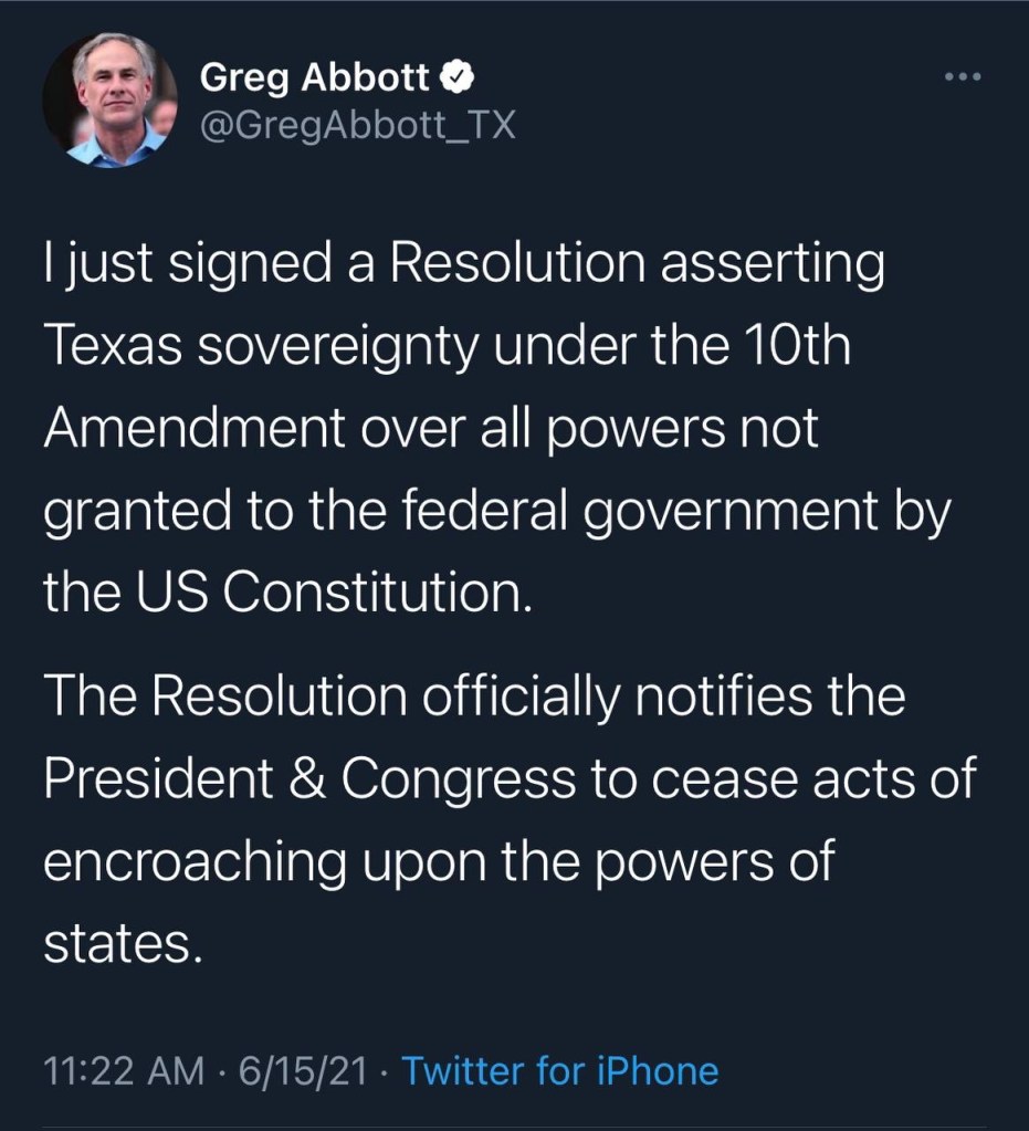 Greg Abbott, gobernador de Texas: “Acabo de firmar una Resolución que afirma la soberanía de Texas en virtud de la 10a Enmienda sobre todos los poderes no concedidos al gobierno federal por la Constitución de los Estados Unidos.
