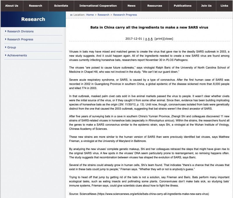 «Después de cinco años de estudiar murciélagos en una cueva en la provincia de Yunnan, en el sur de China, Zhengli Shi y sus colegas descubrieron 11 nuevas cepas de virus relacionados con el SARS en murciélagos de herradura (especialmente en Rhinolophus sinicus). Dentro de las cepas, los investigadores encontraron todos los genes para hacer que un coronavirus del SRAS sea similar a la cepa epidémica, dice Shi, virólogo del Instituto de Virología de Wuhan, Academia China de Ciencias.