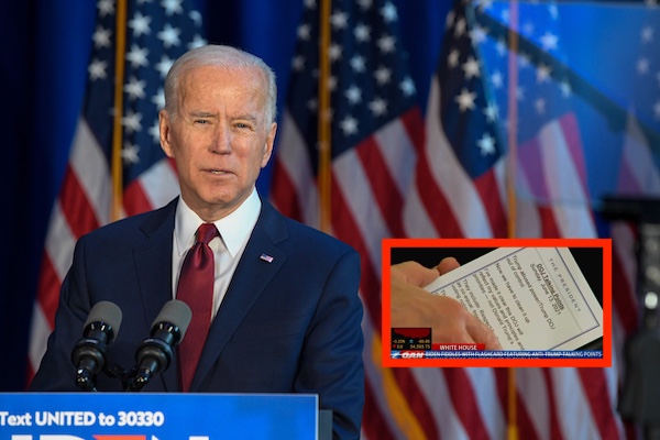 Una foto de cerca de OAN en la conferencia del G7 muestra exactamente lo que el presidente Joe Biden y sus manipuladores están poniendo en sus patéticas tarjetas flash.