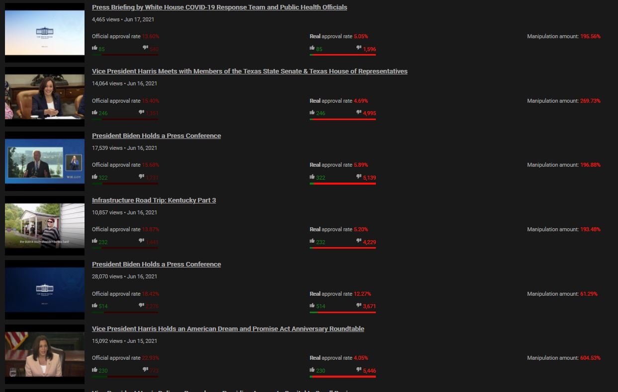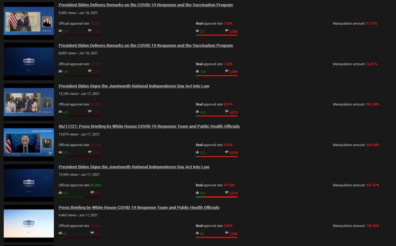 El sitio web rastrea la página de YouTube de la Casa Blanca de Joe Biden. Y después de varias semanas de resultados puede confirmar que YouTube de extrema izquierda está suprimiendo las aversiónes en los videos de Joe Biden.