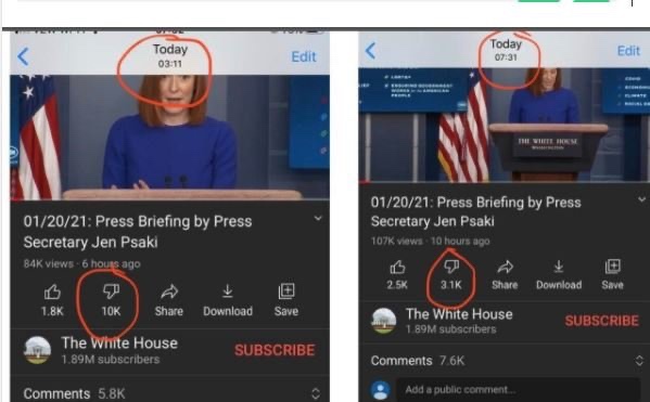 De hecho, ¡las aversiónes en la página de YouTube de la Casa Blanca están siendo manipuladas en cada video de Joe Biden en la Casa Blanca!