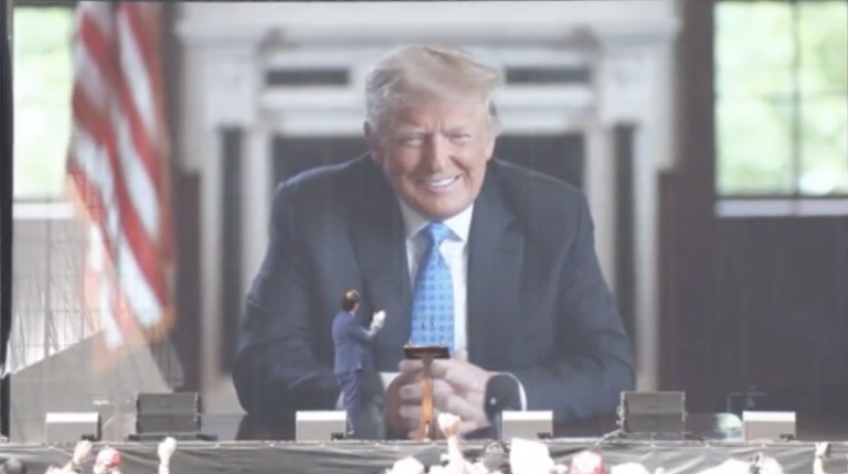 Y si quieres ver el clip COMPLETO, incluido el presidente Trump en la pantalla gigante, lo tengo para ti.