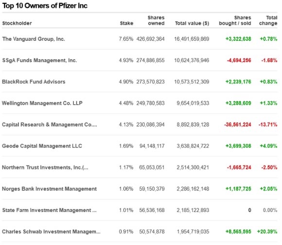 Según Simply Wall Street, en febrero de 2020, BlackRock y Vanguard fueron los dos mayores accionistas de GlaxoSmithKline, con un 7% y un 3,5% de acciones respectivamente. En Pfizer, la propiedad se invierte, siendo Vanguard el principal inversor y BlackRock el segundo accionista más grande.