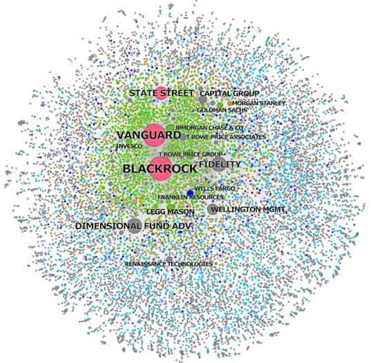 En total, BlackRock y Vanguard tienen propiedad de unas 1.600 empresas estadounidenses, que en 2015 habían combinado ingresos de 9,1 billones de dólares. Cuando se agrega el tercer propietario global más grande, State Street, su propiedad combinada abarca casi el 90% de todas las empresas de S&P 500.