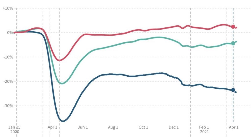 Acabamos de recibir otro ejemplo. Un nuevo análisis de datos de la Universidad de Harvard, la Universidad de Brown y la Fundación Bill y Melinda Gates calcula cómo se han visto afectados los diferentes niveles de empleo durante la pandemia hasta la fecha. Los resultados revelan que las órdenes de cierre por parte del gobierno devastaron a los trabajadores de la parte inferior de la cadena financiera, pero dejaron a los de la parte superior en mejor situación en realidad.