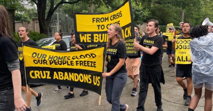 “Alrededor de 50 @sunrisemvmt Manifestantes afuera de la casa de Ted Cruz Houston exigiendo que Biden detenga las negociaciones con el Partido Republicano y pase @AOC plan del cuerpo civil de clima. Algunos están en el césped mientras la multitud canta “¿De qué lado estás?” Cerca de una docena de policías y guardias de seguridad”.