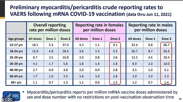 El Dr. Tom Shimabukuro, subdirector de la Oficina de Seguridad de Inmunización de los CDC, dijo en una presentación que los datos de uno de los sistemas de monitoreo de seguridad de la agencia – Vaccine Safety Datalink (VSD) – sugieren una tasa de 12,6 casos por millón en las tres semanas posteriores a la segunda inyección en niños de 12 a 39 años.