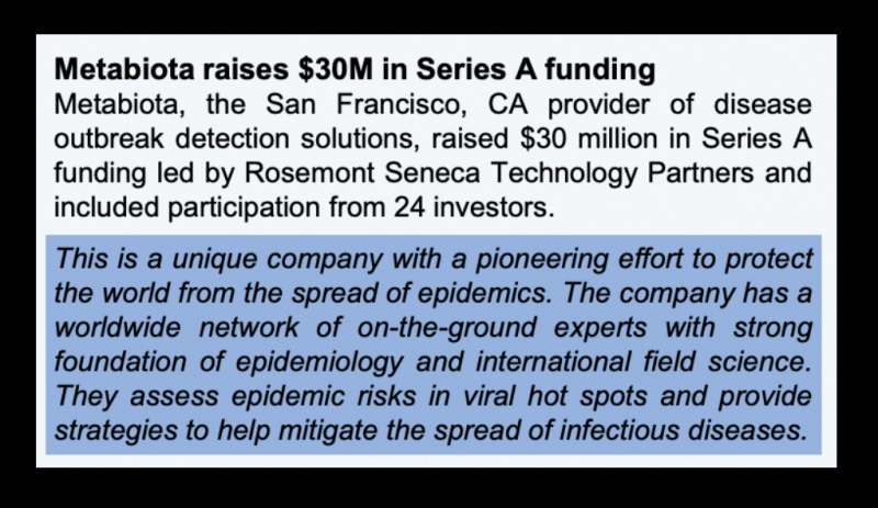 Una de las empresas mencionadas en las versiones archivadas de la cartera de la firma es Metabiota, una startup con sede en San Francisco que afirma detectar, rastrear y analizar nuevas enfermedades infecciosas, ha revelado The National Pulse.