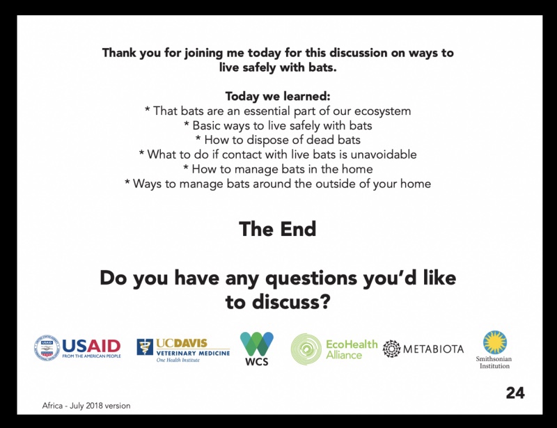Investigadores de EcoHealth Alliance y Metabiota también han colaborado en presentaciones sobre cómo «vivir con seguridad con murciélagos» y estudios que vinculan brotes emergentes de enfermedades infecciosas con instalaciones de comercio de vida silvestre, incluidos «mercados húmedos».