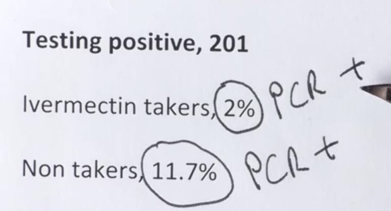 En una prueba de más de 4000 personas en la India (más de 3000 tomaron Ivermectina) y más de 1000 no lo hicieron. Los resultados fueron que el 2% de los que toman Ivermectina tuvieron la prueba de PCR confirmada COVID y el 11,7% de los no tomadores tuvieron la prueba de PCR confirmada COVID. A las personas se les dieron dos dosis de 21 mg de Ivermectina. Esto cuesta menos de 1 centavo por persona.