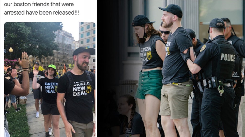 A diferencia de las personas que fueron arrestadas por ingresar ilegalmente al edificio del Capitolio de los Estados Unidos el 6 de enero, los manifestantes del Green New Deal fueron liberados de la custodia policial pocas horas después de ser arrestados.